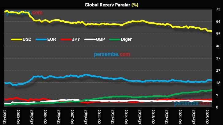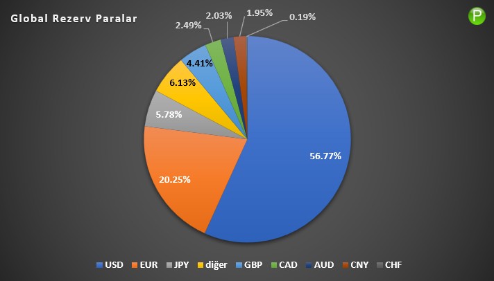 USD % 56,77 EUR % 20,25 JPY % 5,78 GBP % 4,41 CAD % 2,49 AUD % 2,03 CNY %1,95 CHF % 0,19 Diğerleri % 6,13